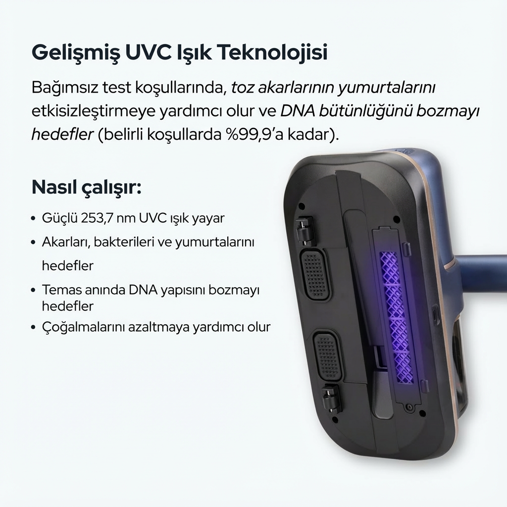 Dual Beat titreşim sistemi, derinlere sıkışmış partikülleri yerinden oynatır; UV sterilizasyonu ve tamamen kapalı HEPA filtreleme ise bu partiküllerin yok edilmesini ve tekrar havaya karışmamasını sağlar.